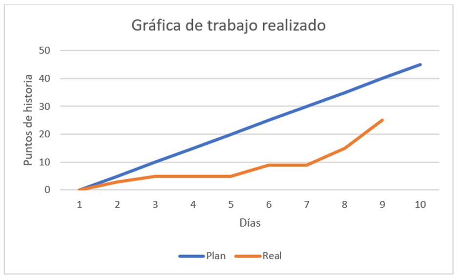 El equipo está utilizando una gráfica de trabajo realizado (Burnup chart)como se presenta a continuación. ¿Qué podemos afirmar con esta información?