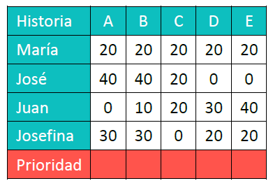 En base al método de los 100-puntos, calcule la prioridad de las siguientes historias de usuario e indique a continuación el nombre de la historia de usuario con prioridad 1