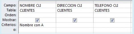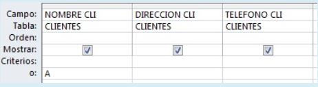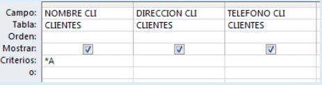 Mostrar el Nombre, Dirección y Teléfono de los CLIENTES cuyo nombre empieza con la letra A