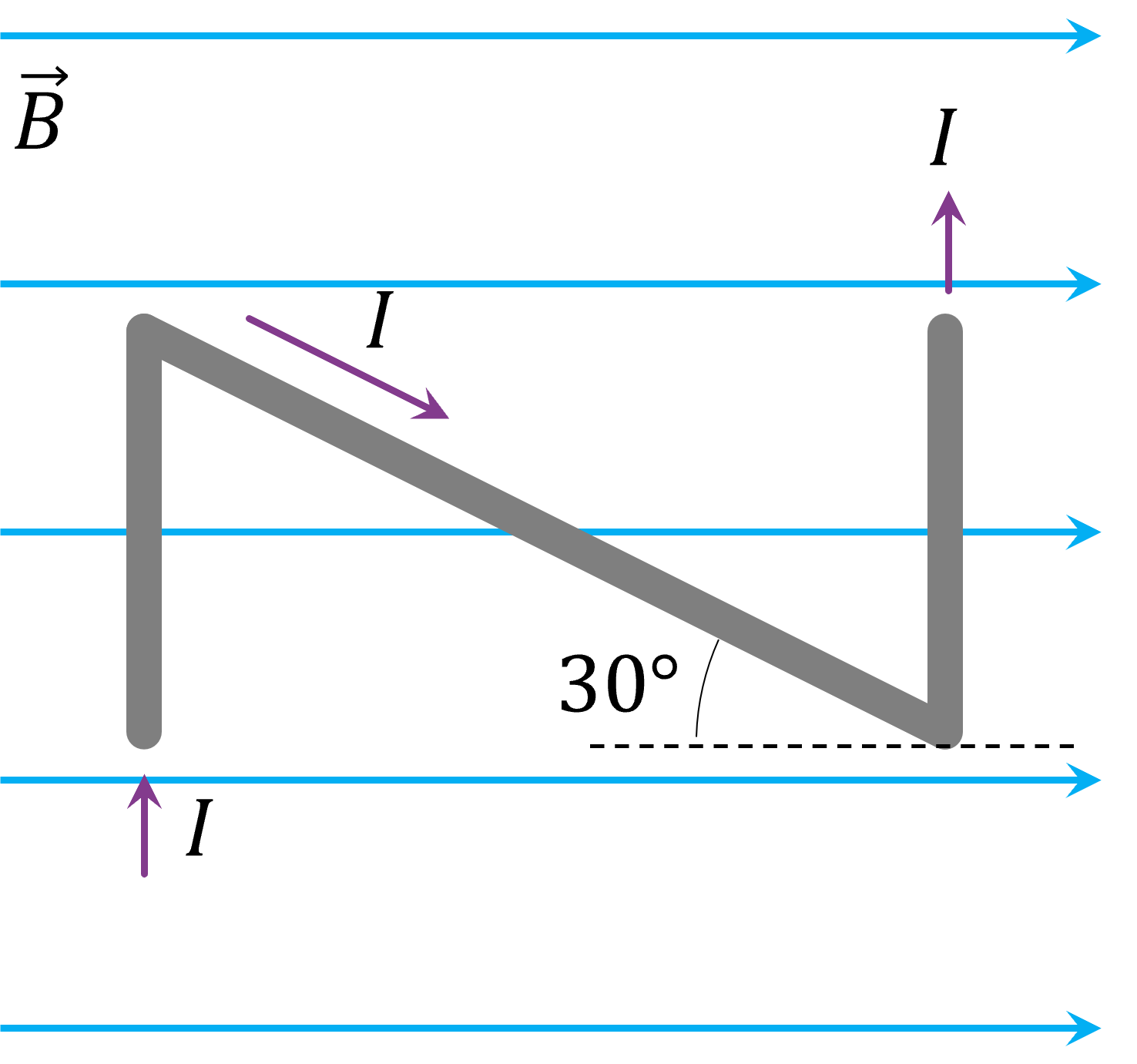 B-I-N-I-verse. A wire, bent as shown, is immersed in a uniform magnetic field 2.50 [T] directed to the right. The vertical segments are 1 [m] long while the diagonal segment is [m]. Current 4.00 [A] flows in the direction shown. What is the net force on the wire?