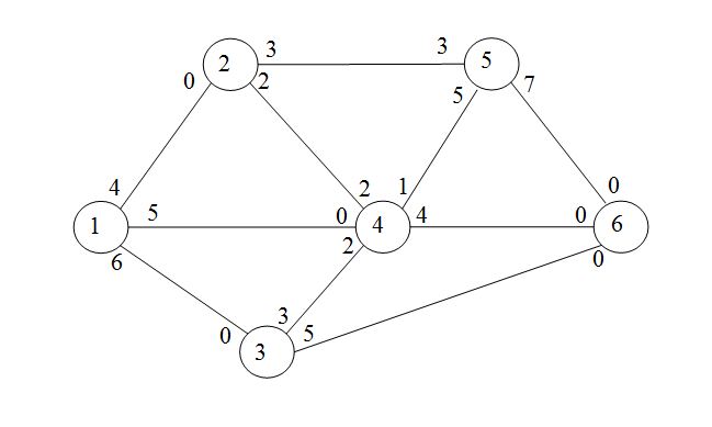 Мережа автодоріг, що проходять через деяку область, може забезпечити пропускні здатності (тис. автомашин за годину), які вказані на рисунку. Потрібно визначити максимальний потік у заданій мережі.