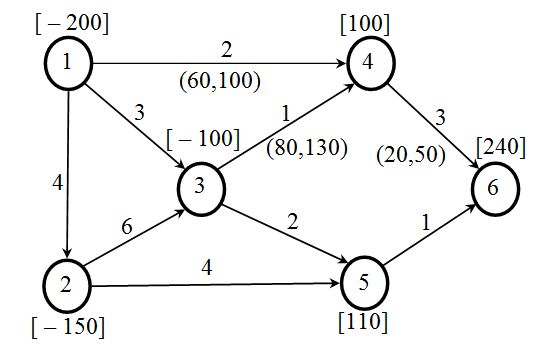 Для перевезення зерна з трьох зерносховищ до трьох агропромислових підприємств використовується залізничний та автомобільний транспорт. Можливі маршрути перевезень зображено на рисунку. Пропозиція зерносховищ (пункти 1, 2, 3) становить відповідно 200, 150 та 100 тон, а попит агропромислових підприємств (пункти 4, 5, 6) – 100, 110 та 240 тон. На маршрутах, де використовується автомобільний транспорт, є нижнє та верхнє обмеження пропускної здатності. Пропускна здатність залізничного транспорту практично необмежена. Вартість транспортування однієї тони зерна на кожному маршруті (в сотнях гривень) наведено біля відповідної дуги. Потрібно визначити план перевезення найменшої вартості.