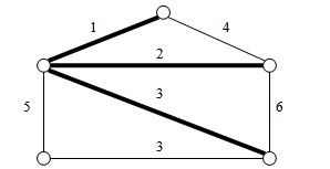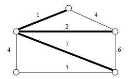 На рисунку наведено граф та частково сформоване мінімальне кістякове дерево (позначено потовщеними лініями). Який алгоритм міг в процесі своєї роботи (не обов'язково в кінці) сформувати таке тимчасове кістякове дерево?