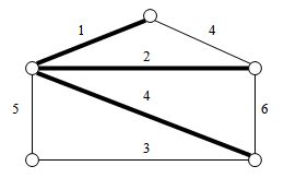 На рисунку наведено граф та частково сформоване мінімальне кістякове дерево (позначено потовщеними лініями). Який алгоритм міг в процесі своєї роботи (не обов'язково в кінці) сформувати таке тимчасове кістякове дерево?