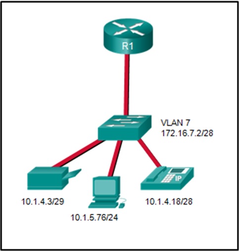Подивіться на рисунок. Мережевому адміністратору необхідно налаштувати модель router-on-a-click для зображених мереж. Скільки субінтерфейсів потрібно створити на маршрутизаторі, якщо потрібно маршрутизувати кожну із зображених мереж, і кожна мережа VLAN використовує власний субінтерфейс?