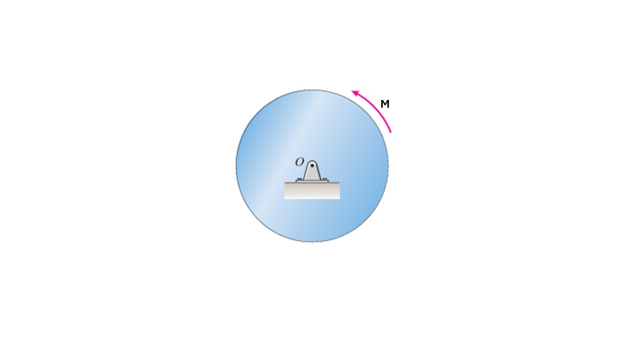 El momento de inercia del disco mostrado respecto a "O" es I = 85 kg-m2. En t = 0, el disco en reposo se somete a un par de torsión constante M= 132 N-m. ¿A qué velocidad (en rpm) estará girando el disco cuando t = 22 s?