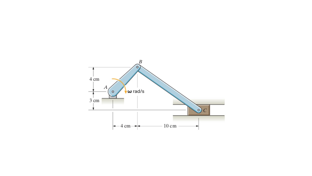 La barra AB mostrada gira a 63 rad/s en el sentido de las manecillas del reloj. Determine la velocidad (en cm/s) del deslizador C.