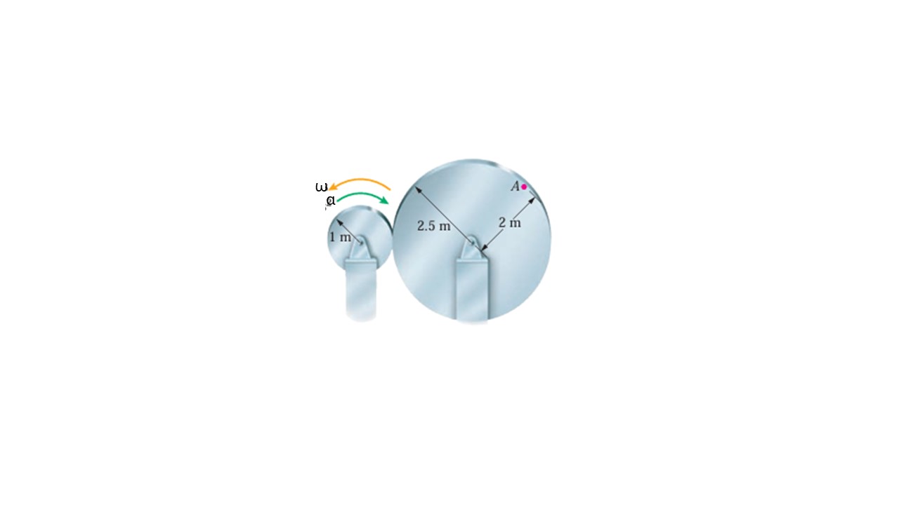 En el instante mostrado, el disco izquierdo tiene una velocidad angular de 22 rad/s en sentido contrario al de las manecillas del reloj y una aceleración angular de 33 rad/s2 en la dirección de las manecillas del reloj. ¿Cuál es la magnitud de la aceleración del punto A?