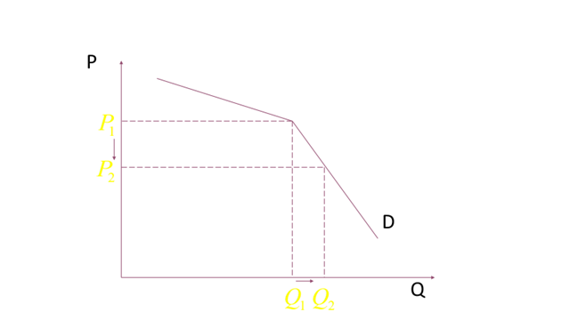 Koks bus oligopolijos paklausos elastingumas, jei firma sumažins kainą nuo P1 iki P2?