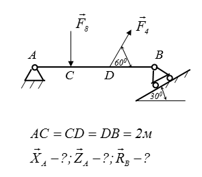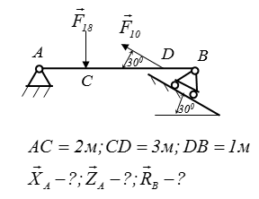 На балку АВ діють дві активні сили. Визначіть реакції в'язей, нехтуючи вагою балки.