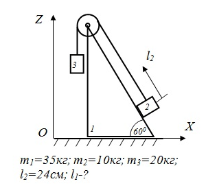 Тягарі 2 і 3 з’єднані нерозтяжною ниткою, яка перекинута через невагомий блок, рухаються відносно трикутної призми. Визначіть величину переміщення трикутної призми вздовж горизонтальної ідеально гладкої площини, якщо тягар переміститься відносно однієї із поверхонь трикутної призми на величину