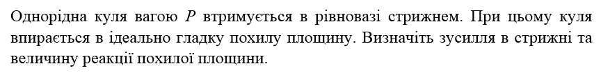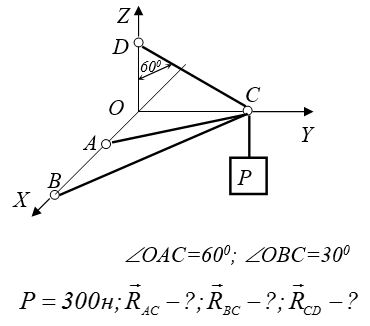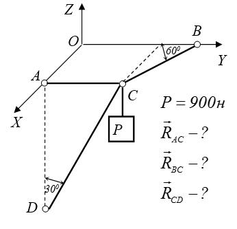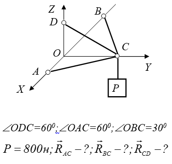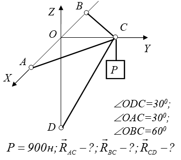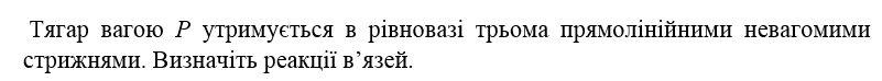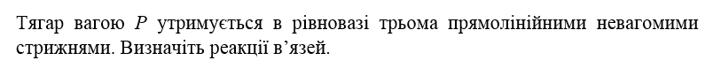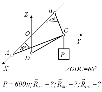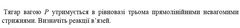 Тягар вагою Р утримується в рівновазі трьома невагомими стрижнями АС, ВС та DC. Визначіть реакції стрижнів.