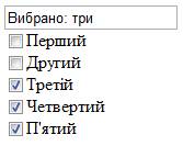 Написати код HTML сторінки з JavaScript кодом. На формі розташовано текстове поле та п’ять прапорців (CheckBox). В текстовому полі має відображатись кількість відмічених в даний момент прапорців. За замовченням напис в текстовому полі: «Вибрано: нуль» (або «Вибрано: 0»).