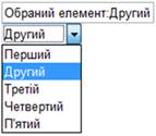 Написати код HTML сторінки з JavaScript кодом. На формі розташовано текстове поле та спадний список (список містить п’ять елементів). В текстовому полі має відображатись напис з обраного елементу зі спадного списку в форматі: «Обраний елемент: «напис зі спадного списку». За замовченням напис в текстовому полі: «Оберіть елемент».