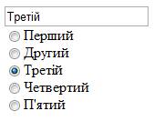 Написати код HTML сторінки з JavaScript кодом. На формі розташовано текстове поле та п’ять перемикачів (Radio). При виборі перемикача його текст має з’явитись в текстовому полі.