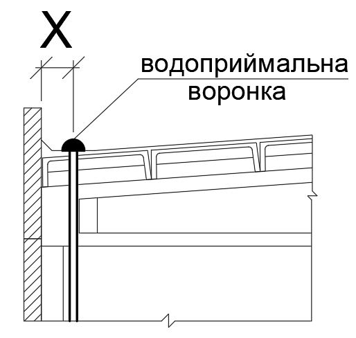 Яка віддаль (позначено "Х") від осі водоприймальної воронки до поздовжньої розміткової координаційної осі?