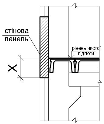 Яка віддаль (позначено "Х") приймається від рівня чистої підлоги до низу уніфікованих легкобетонних стінових панелей багатоповерхових виробничих будівель, згідно наведеного малюнку?