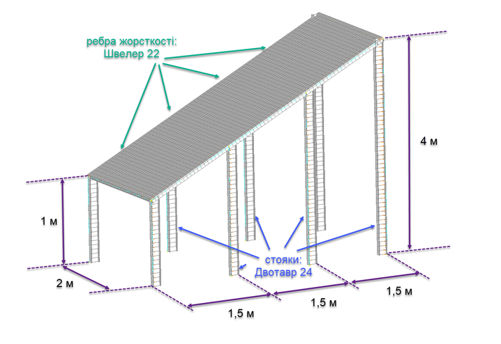 Побудувати геометричну та скінченно-елементну модель навісу показаного на рисунку. Здійснити статичний розрахунок конструкції. Величину і місце навантаження вибрати самостійно. Товщину