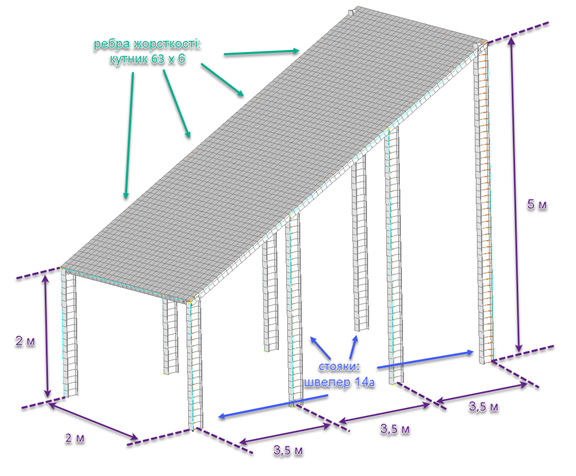 Побудувати геометричну та скінченно-елементну модель навісу показаного на рисунку. Здійснити статичний розрахунок конструкції. Величину і місце навантаження вибрати самостійно. Товщину