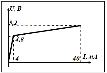 Визначіть коефіцієнт стабілізації параметричного стабілізатора напруги з точністю до цілих чисел. Вхідна напруга Ubx=9В, Напруга стабілізації Ucт=5B, баластний опір R0=300. ВАХ стабілітрона представлена на рисунку.