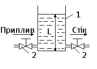 Який об'єкт регулювання (ОР) рівня зображено на рисунку, де: 1 - резервуар; 2 – дросельний регулюючий клапан: