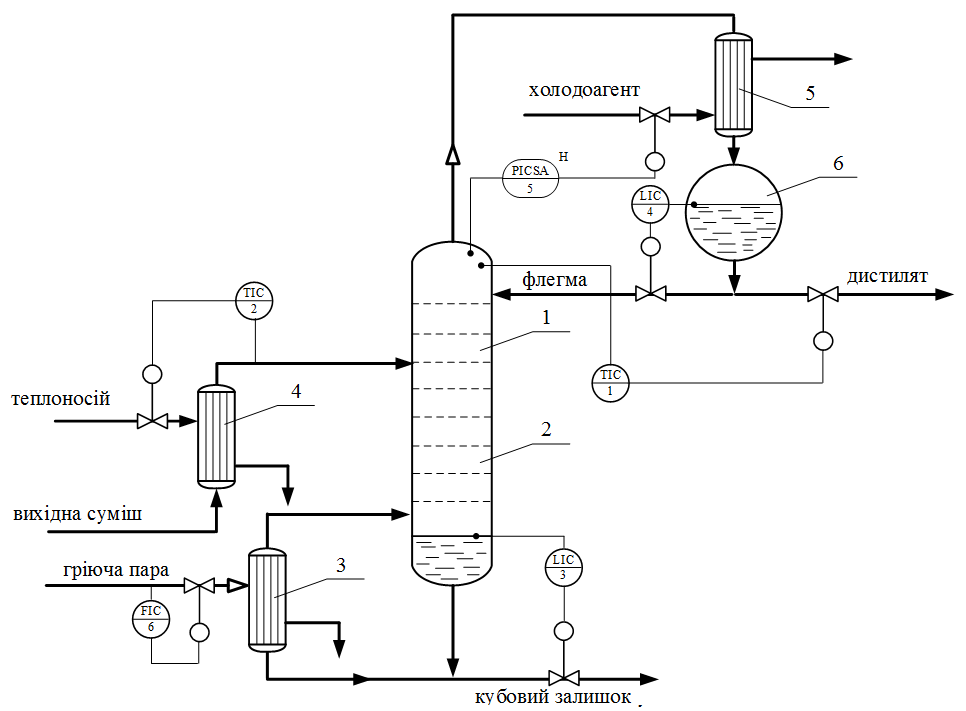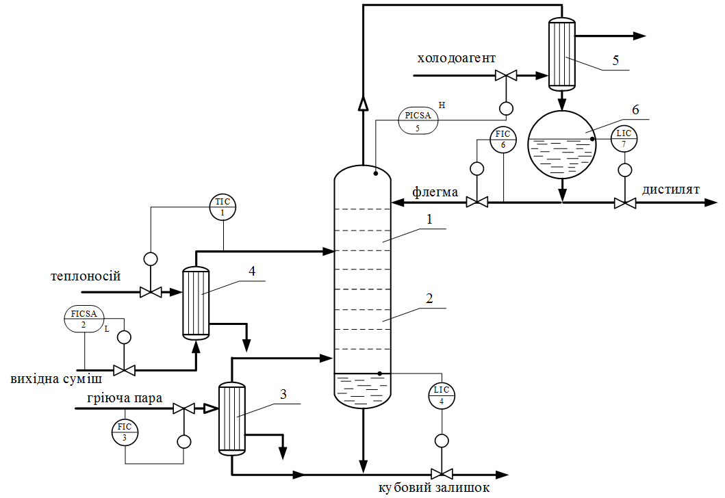 На приведеній нижче схемі автоматизації зображено систему автоматизації верху тарілчастої ректифікаційної колони з: