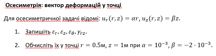 Для осесиметричної задачі запишіть вектор деформацій і поясніть, звідки береться