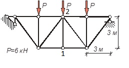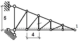 Визначити ординату лінії впливу зусилля у відміченому стержні під вузлом 1.