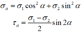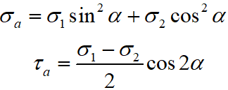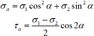 Напруження на похилих площинках при плоскому напруженому стані знаходяться за формулами: