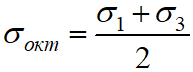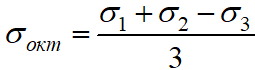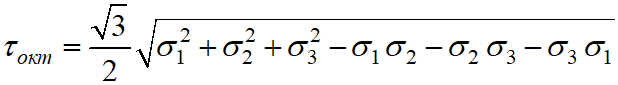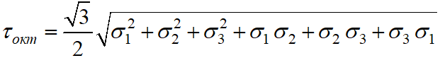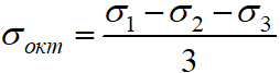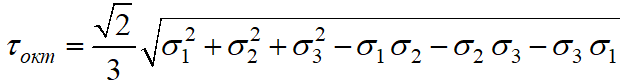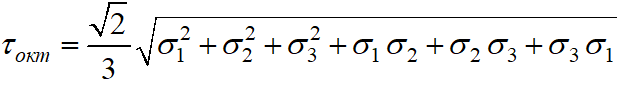 Октаедричне дотичне напруження при об’ємному напруженому стані має вигляд …