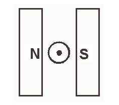 Напрям струму в провіднику, що знаходиться в магнітному полі двох постійних магнітів — вперед до спостерігача (·). Який напрям матиме сила, що діятиме на цей провідник? Поперечний переріз цієї магнітної системи показано на рисунку.