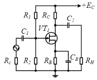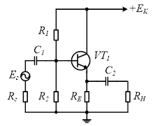 Для наведеної схеми підсилювального каскаду розрахувати коефіцієнт підсилення за напругою. Дано: 2 В,