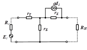 В еквівалентній схемі заміщення, поданій на рисунку, біполярний транзистор має наступні значення власних параметрів: =500 Ом, =1 МОм і a=0,97. Опір =2 кОм, внутрішній опір джерела сигналу =500 Ом. Визначити