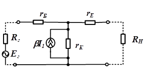 В еквівалентній схемі заміщення, поданій на рисунку, має наступні значення власних параметрів: =200 Ом, =500 кОм і =0,975. Опір =5 кОм, внутрішній опір джерела сигналу =10 Ом. Визначити вхідний опір підсилювального каскаду.