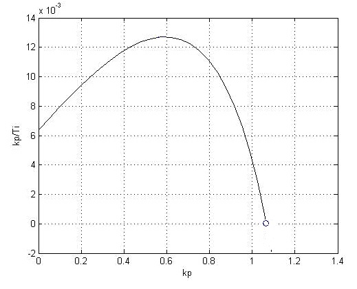 Як зміниться якість САР, якщо параметри ПІ-регулятора зміняться вздовж границі області запасу стійкості від вказаної точки вправо?