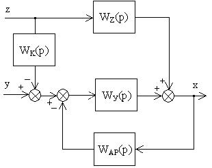 Яка функція передачі компенсатора Wk(p) забезпечить інваріантність САР, схема якої показана на рисунку, якщо функція передачі OP за збуренням Wz(p)=1/(25p+1), за регулюючою дією Wy(p)=0.1/p і регулятора WAP(p)=1+1/(25p)?