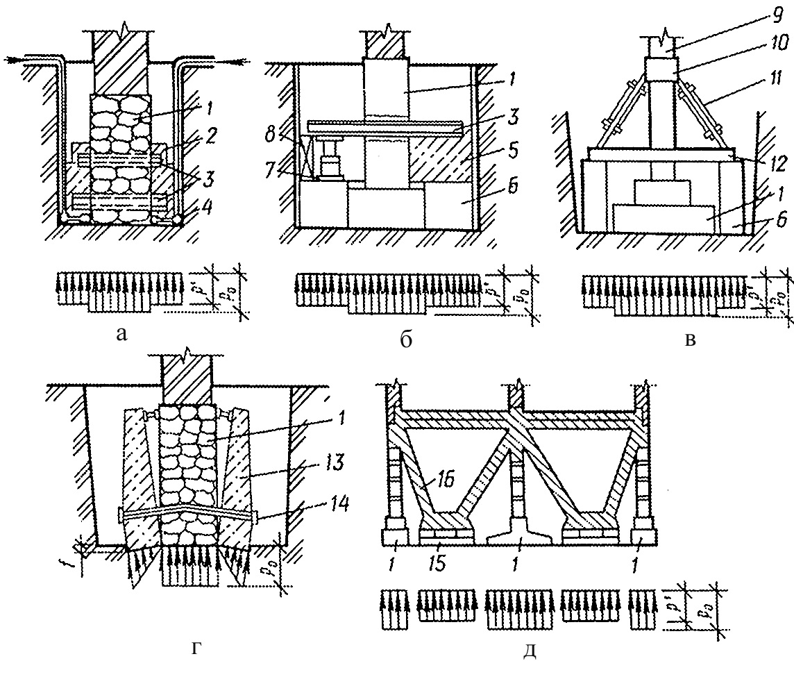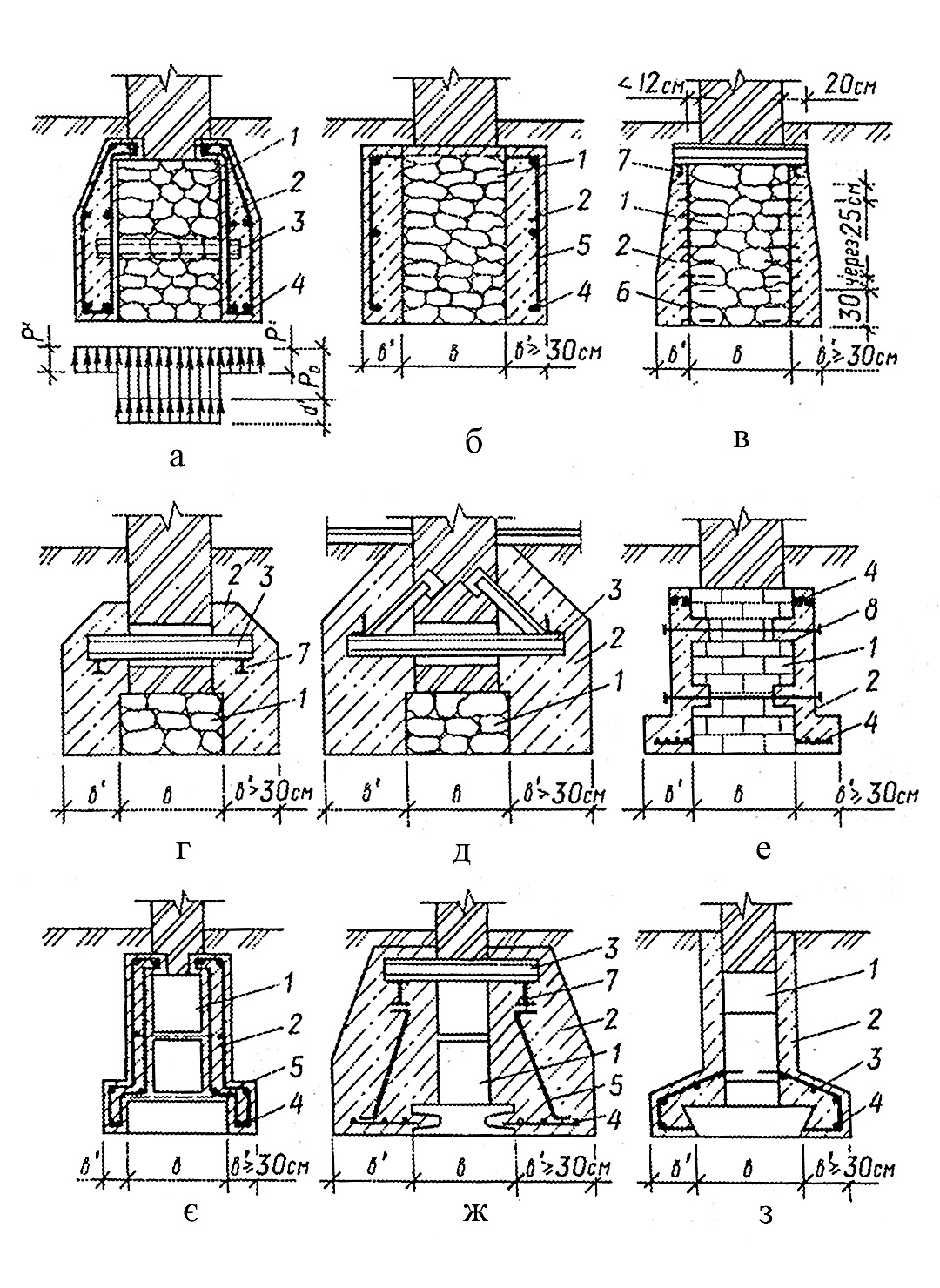 монолітними банкетами за допомогою:Схеми розширення та підсилення стрічкових фундаментів