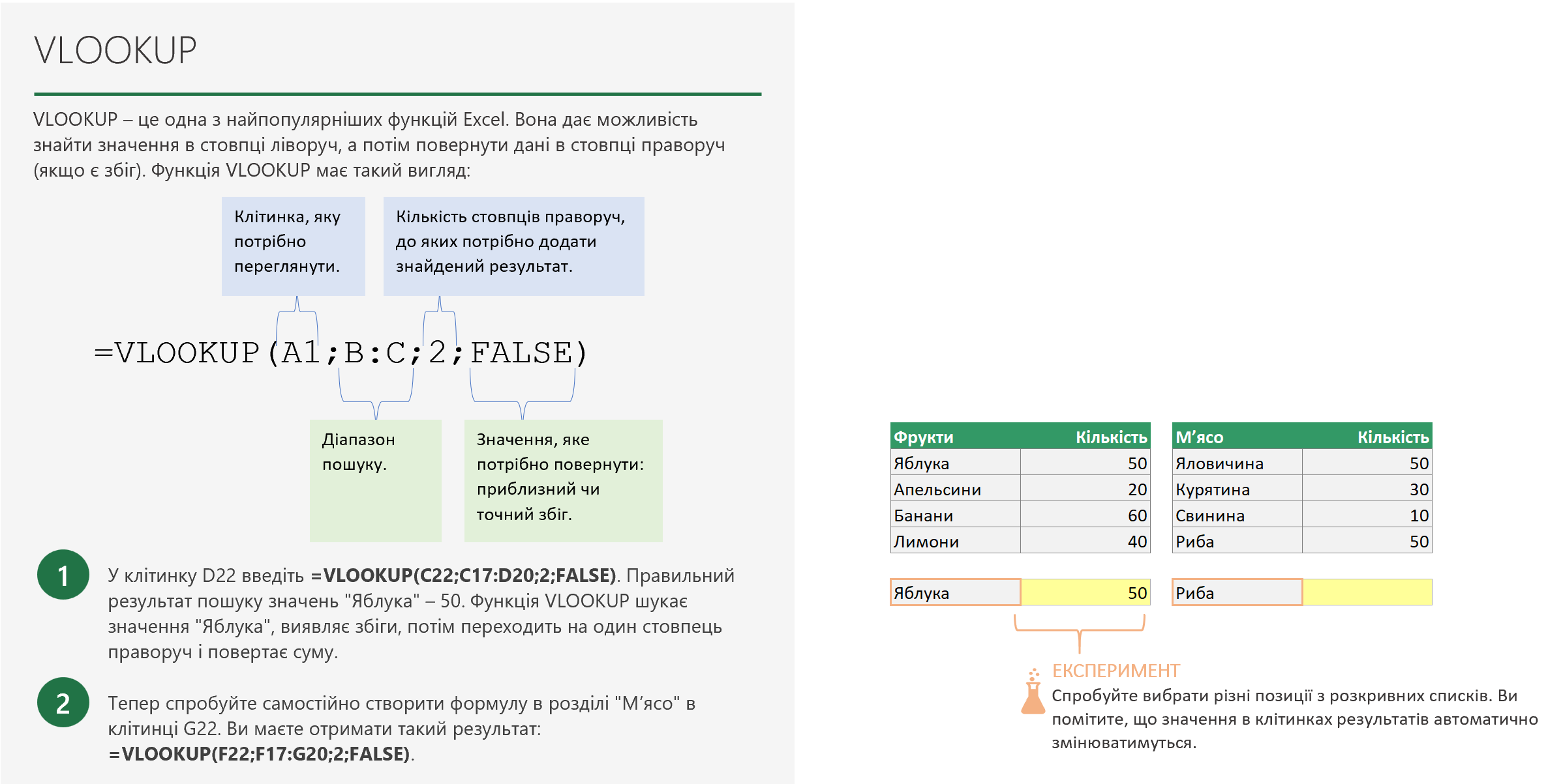 Спробуйте самостійно створити формулу в розділі "М’ясо" в клітинці G22. Ви маєте отримати такий результат: =VLOOKUP(F22;F17:G20;2;FALSE). Яке саме число відобразиться в клітинці G22, якщо у F22 буде обрано варіант "Риба"?