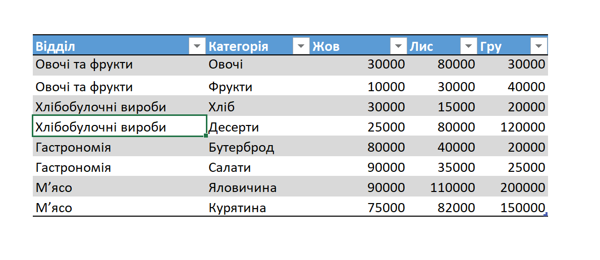 В даній таблиці задано розфарбування та кольори шрифтів за допомогою інструменту " Стиль таблиці". Вкажіть на якій вкладинці можна знайти цей інструмент для версії Ексель що розглядалася на лекції та на практичній роботі №6.