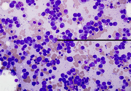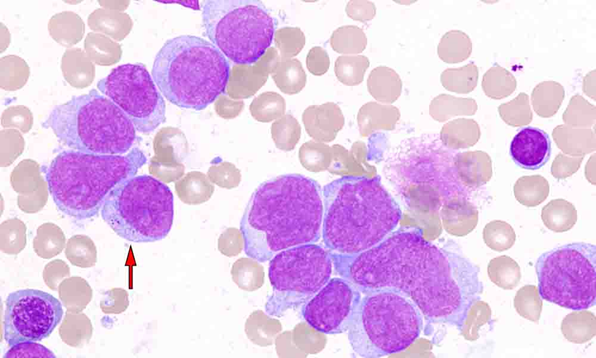 Blast cells: 50% Auer rods are seen in few blast cells.