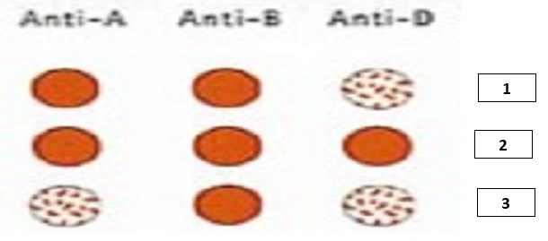 The result of blood grouping test of 3 blood samples determined by slide agglutination method is given below.