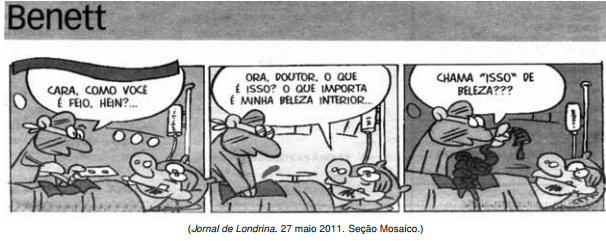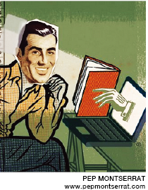 A imagem produzida pelo artista combina elementos de modo surpreendente, inesperado na realidade cotidiana. A figura da mão saindo do computador e oferecendo ao possível leitor um objeto característico de outro espaço de leitura sugere principalmente o sentido de: