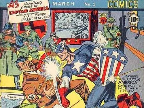 Com sua entrada no universo dos gibis, o Capitão chegaria para apaziguar a agonia, o autoritarismo militar e combater a tirania. Claro que, em tempos de guerra, um gibi de um herói com uma bandeira americana no peito aplicando um sopapo no Führer só poderia ganhar destaque, e o sucesso não demoraria muito a chegar. A capa da primeira edição norte-americana da revista do Capitão América demonstra sua associação com a participação dos Estados Unidos na luta contra: