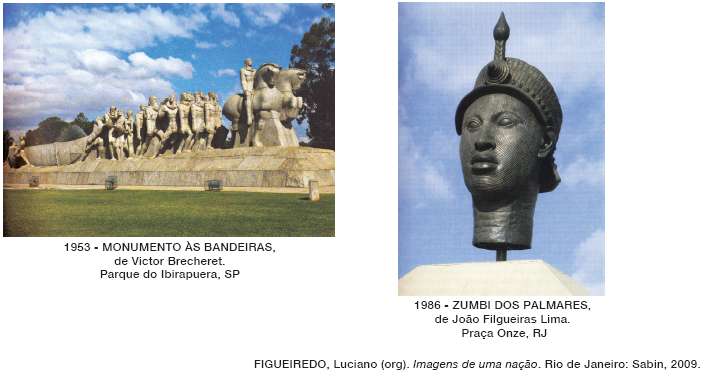 Os monumentos históricos possuem relação com a memória, de modo a destacar imagens e valores para a identidade coletiva de povos e sociedades. As fotos acima retratam monumentos históricos brasileiros produzidos em épocas distintas. A comparação entre ambos evidencia uma mudança referente à identidade nacional brasileira.